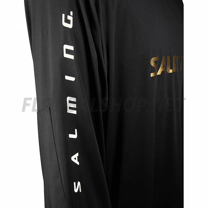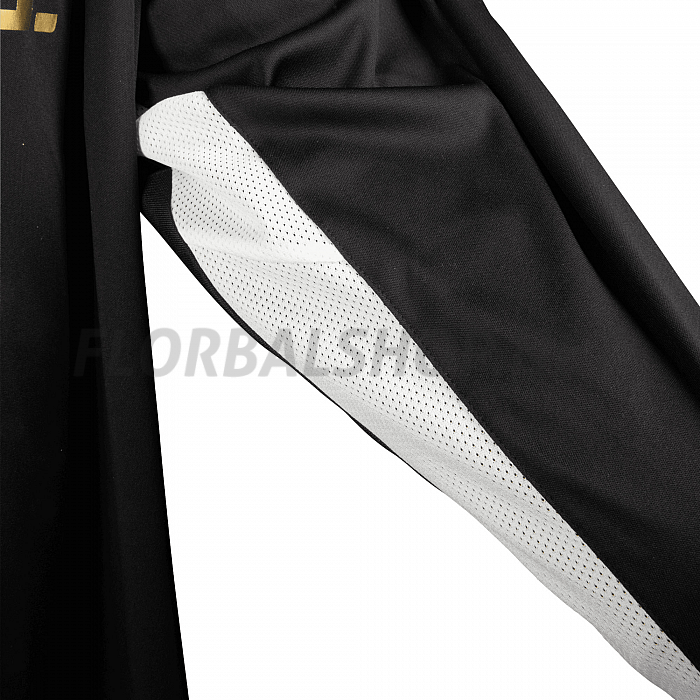 Brankářský dres pro florbalové brankáře od značky Salming, řada React, široký střih, polstrovaná ramena, vyztužené lokty materiálem Cordura, prodyšná síťovina na zádech, černo-zlatá varianta